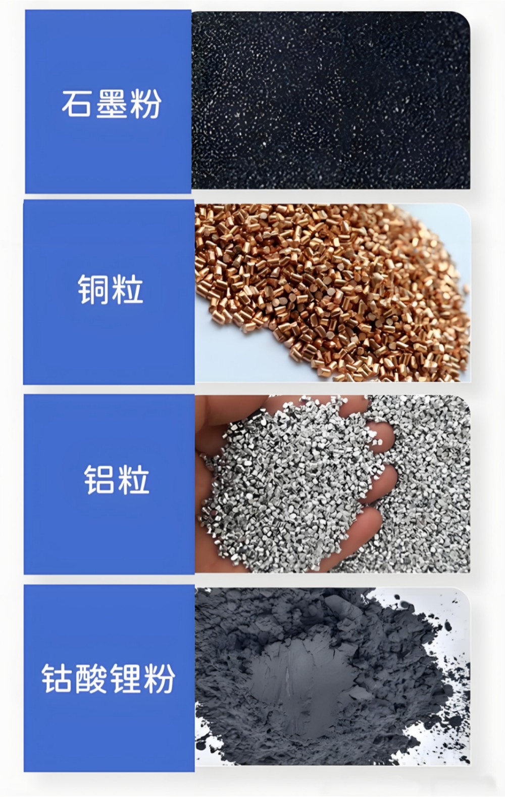 废旧新能源电池经回收设备处理后有石墨粉、铜粒、铝粒、钴酸新能源粉